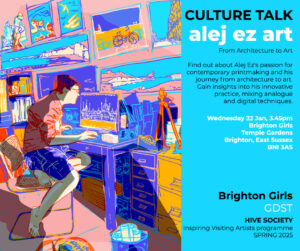 INSPIRE – visiting artist programme Brighton Girls GDST – alej ez January 2025 Brighton Girls GDST has invited me to participate in their programme INSPIRE. With this programme Brighton Girls aims to build a vibrant community, connecting and inspiring students, alumnae, parents, and friends. Believing culture is for all, it offers a programme that nurtures … Continue reading INSPIRE. Wisiting artist programme Brighton Girls GDST. January 2025