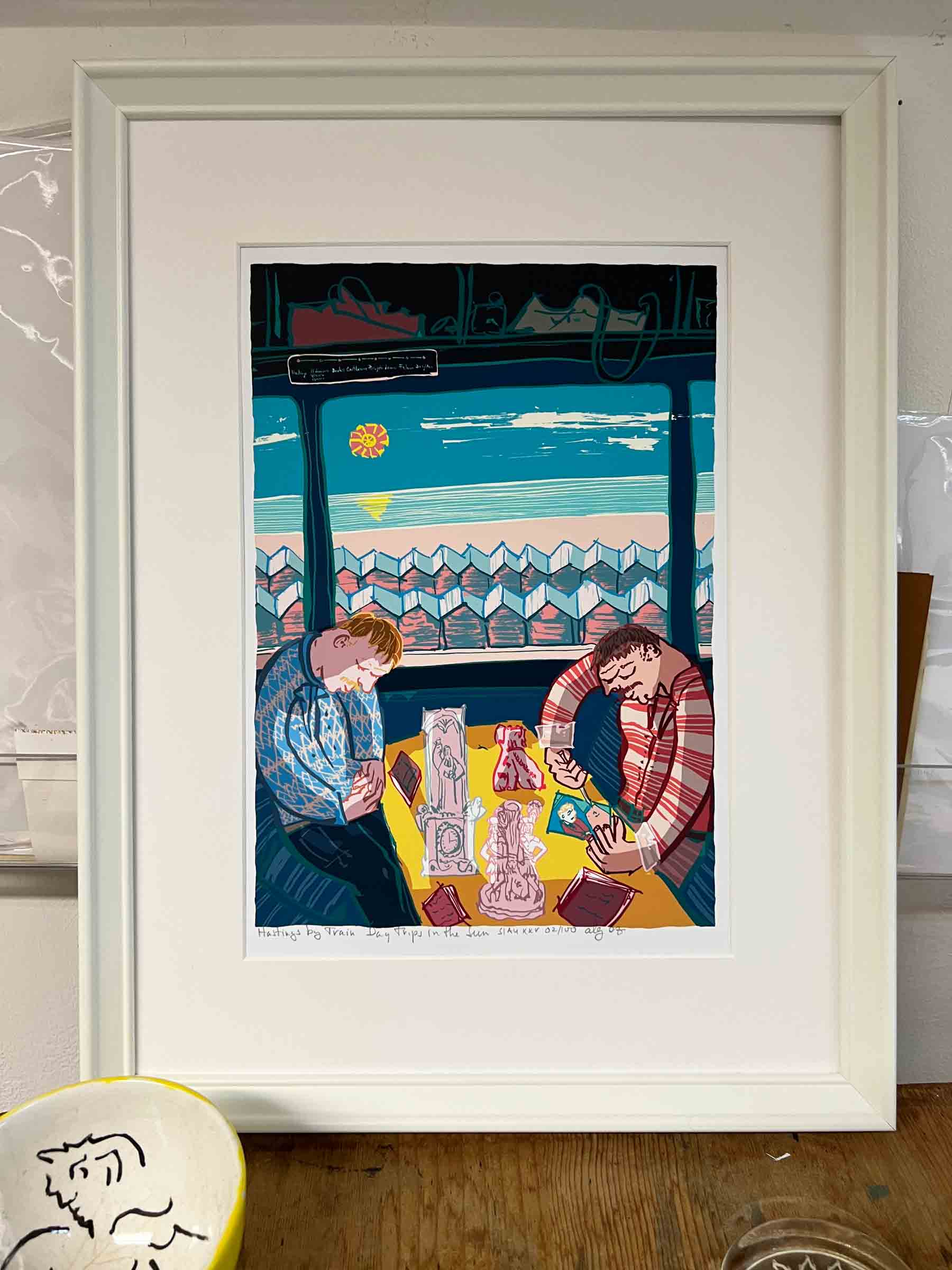Art prints shifted toward people — placed in the corners of the world I love. Quiet tenderness, sun-soaked afternoons, tea by the sea. From Paris and Picasso to Hove and home, evolving. Colour got richer: pinks, reds, yellows — driven by emotion rather than sight. My sketchbooks are now a constant company; confident lines catching moments before they slipped away. Drawing friends, myself, the spaces in-between — where love quietly lives. The architecture loosened, gave way to fluid lines, moving and alive.