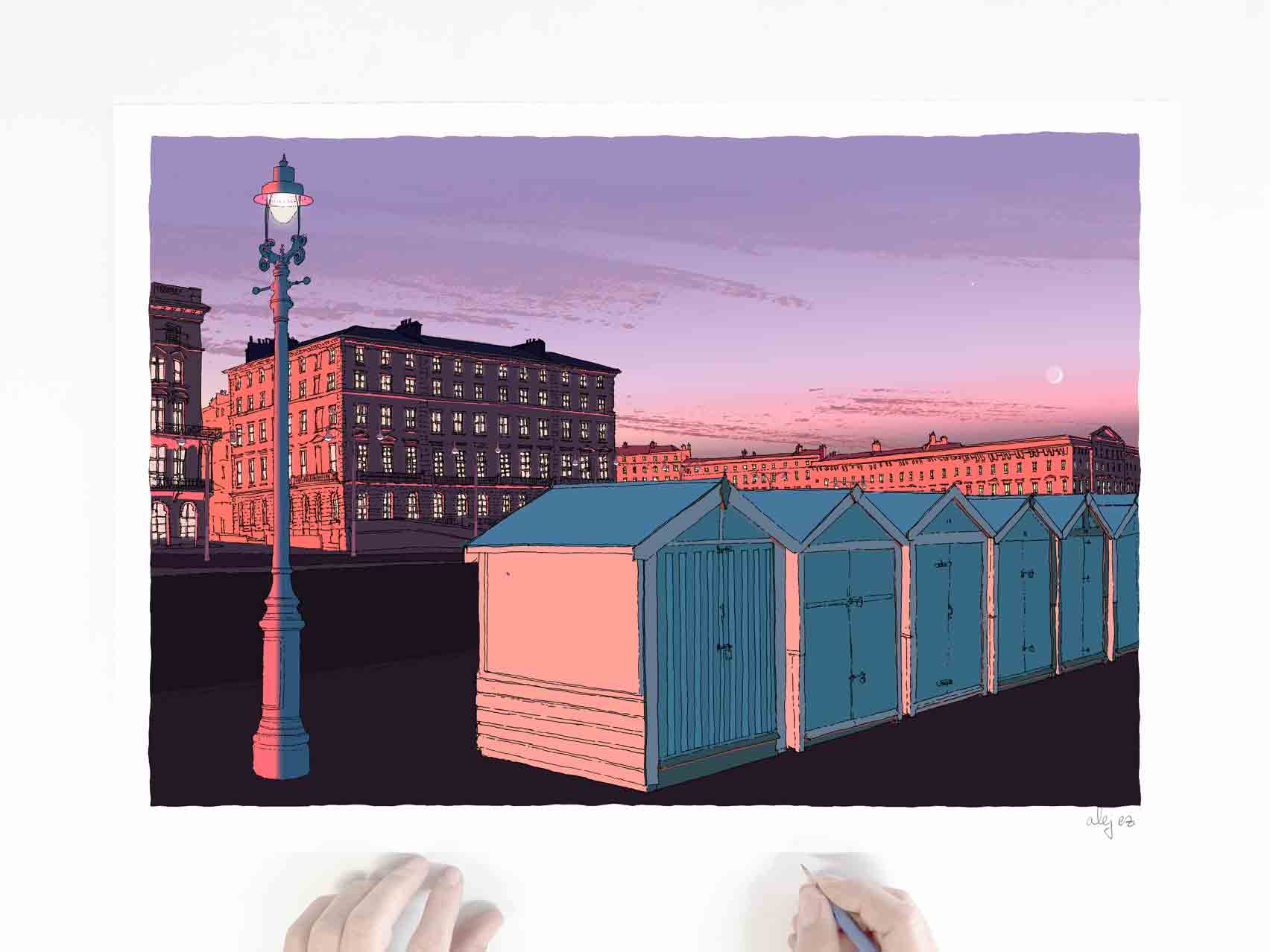 This print shows the quintessential Brighton and Hove beach huts with the background of Adelaide Crescent, one of the grandest open crescent that are so unique to Brighton . Building work started in 1830 to the design of Decimus Burton but was not finished until 1860. Together with the Kemp Town and Brunswick Town estates, the crescent is one of the foremost pre-Victorian residential developments in the Brighton area