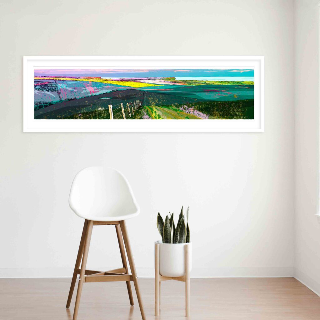 This print depicts one of my favourite walks along the South Downs Way between Southease and Firle, looking towards Seaford and Cuckmere Haven. It’s an epic stretch of the Downs where the white chalk cliffs meet the sea — a landscape that constantly shifts with the seasons and weather. The yellow gorse in bloom marks early spring.