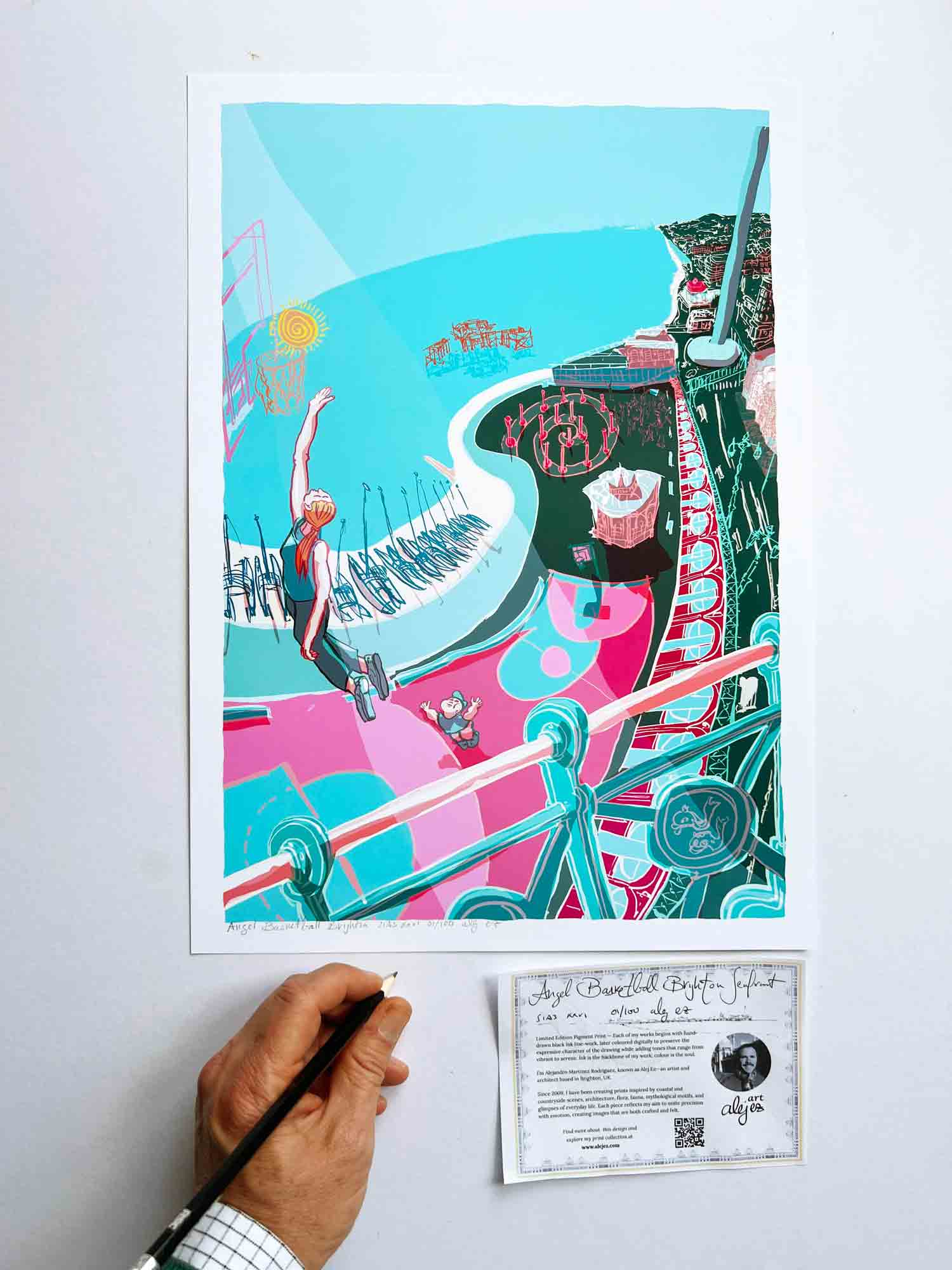 Brighton seafront. I live very near this spot and it is very close to my heart. Under the seafront arches is the West Pier Centre, home of the West Pier Trust. From 2020 to 2024 I was the artist in residence, working on these premises every Thursday. The West Pier Trust celebrates the legacy of the West Pier, and one of their projects is the rebuilding of one of the original kiosks. In my print I show this project as completed.