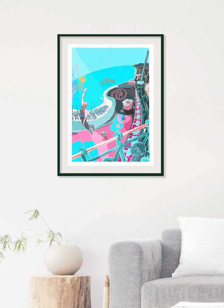 To create this print, I start by crafting individual drawings in ink, which collectively form a collage comprising the final piece. I scan my drawings and digitally add colour. The original design solely exists in digital format, and I print it using archival inks and paper. I then release my design as a limited edition print, available in standard ‘A’ sizes, ranging from A0 (84.1 cm x 118.9 cm) to A4 (21 x 29.7 cm).