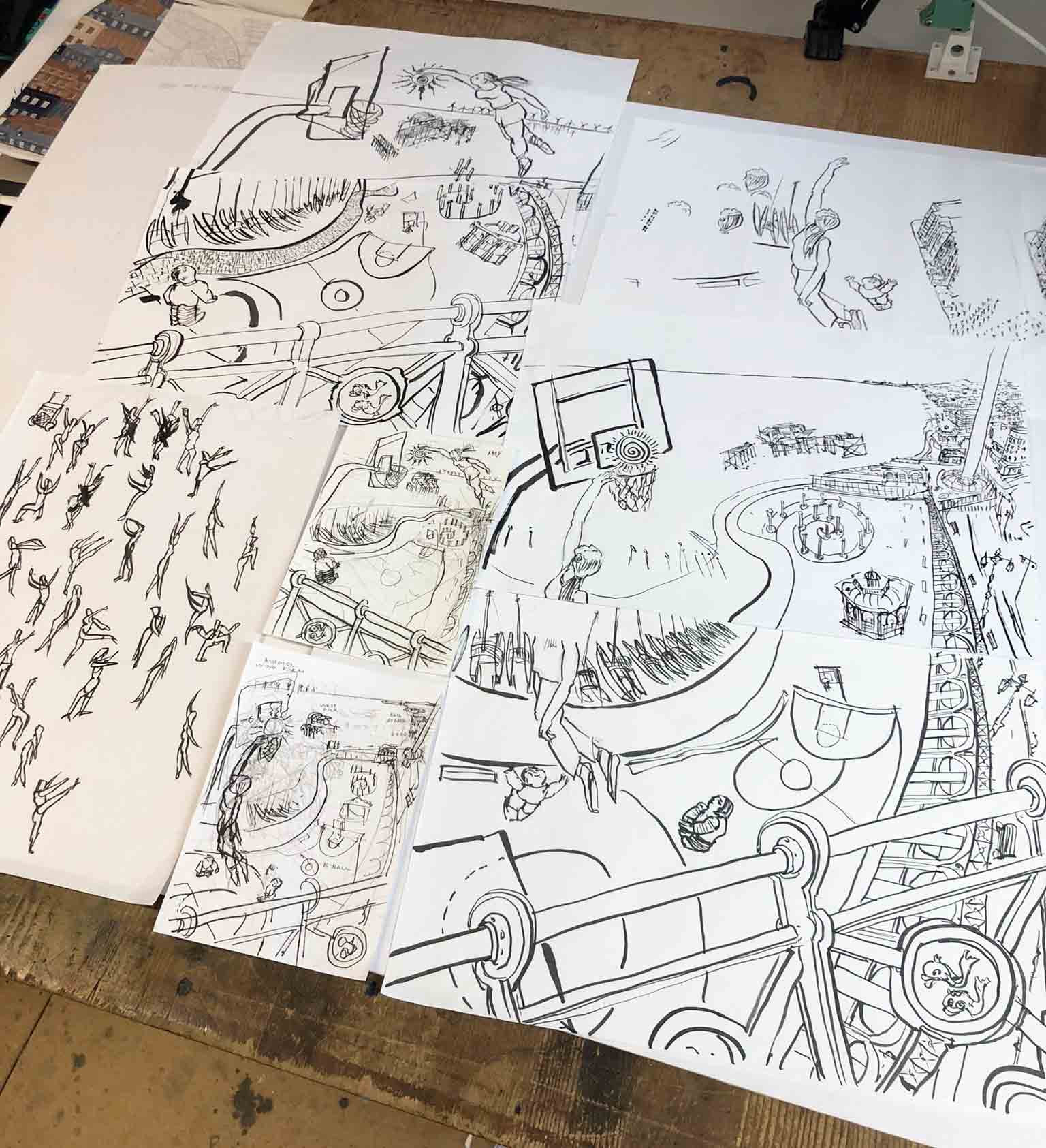 A mother and son play basketball on a pitch on Brighton seafront. The ball she is playing with becomes a sun. I was once told that Jean Cocteau, in the chapel at the fishing village of Villefranche, modelled his angels on the sailors playing basketball by the sea. In this design my angel is of flesh and bone, dedicated to raising her child with health and happiness.