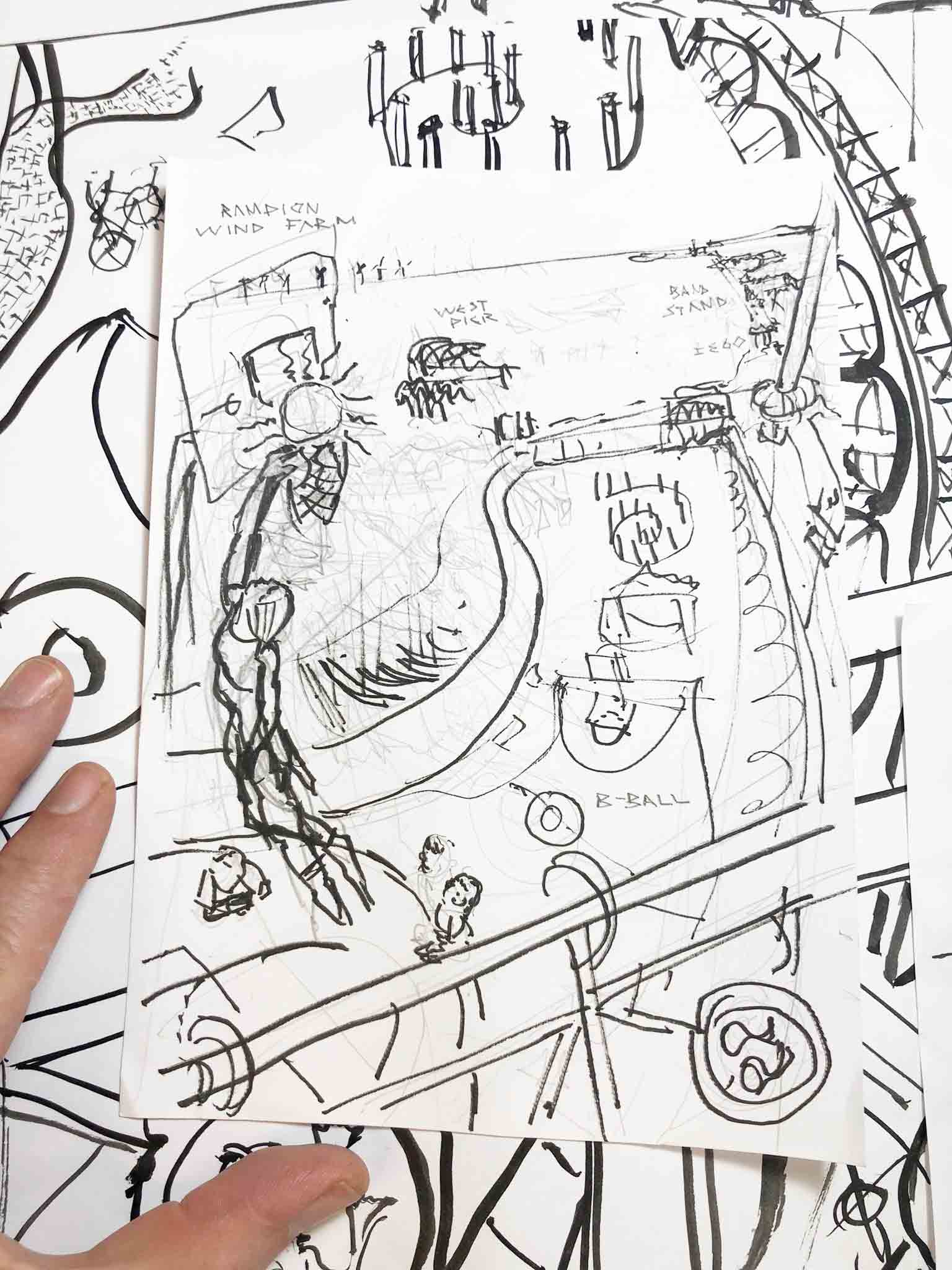 Then there is the mesmerising Golden Spiral. Can you spot some figures dancing next to it? Every Thursday I attend an outdoor dance class in this spot with my teacher, Marta Scott. In this design I have even marked the butterfly roof of my friend Simon’s place, and used just gestural lines in the distance to depict Regency Brunswick Square, where I live by the sea.