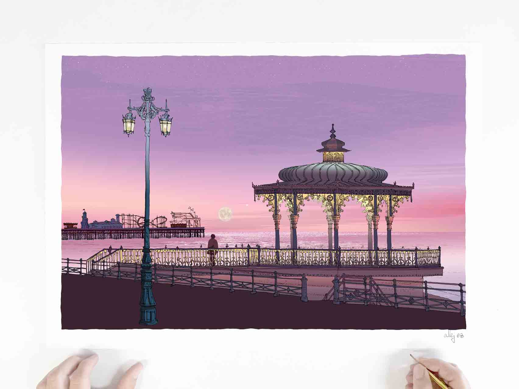 This print captures two much-loved landmarks along the Brighton and Hove promenade: the Palace Pier and the Bandstand. The Brighton Bandstand, built in 1884, is known for its ornate Victorian ironwork and elegant circular form. Often called the “Birdcage,” it sits on the seafront overlooking the beach and is a favourite spot for weddings, music, and quiet moments by the sea. Brighton Palace Pier, which opened in 1899, is the city’s best-known seaside attraction. Stretching out over the water, it is filled with fairground rides, arcades, and food stalls, and remains a lively symbol of Brighton’s culture, fun, and coastal heritage.