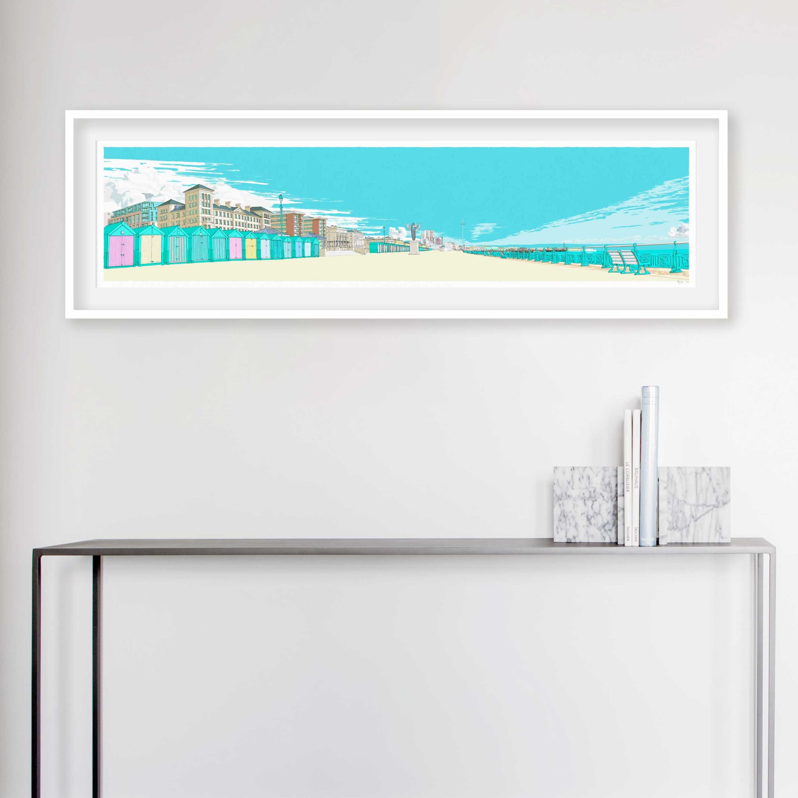 In this art print I depict one of the loveliest walks in Brighton: the expansive view of Brighton seafront by Hove Plinth and Kings Road with the quintessential seaside beach huts. These little houses are built just for the leisure of spending time by the sea, enjoying a cup of tea and reading the paper or your favourite book.