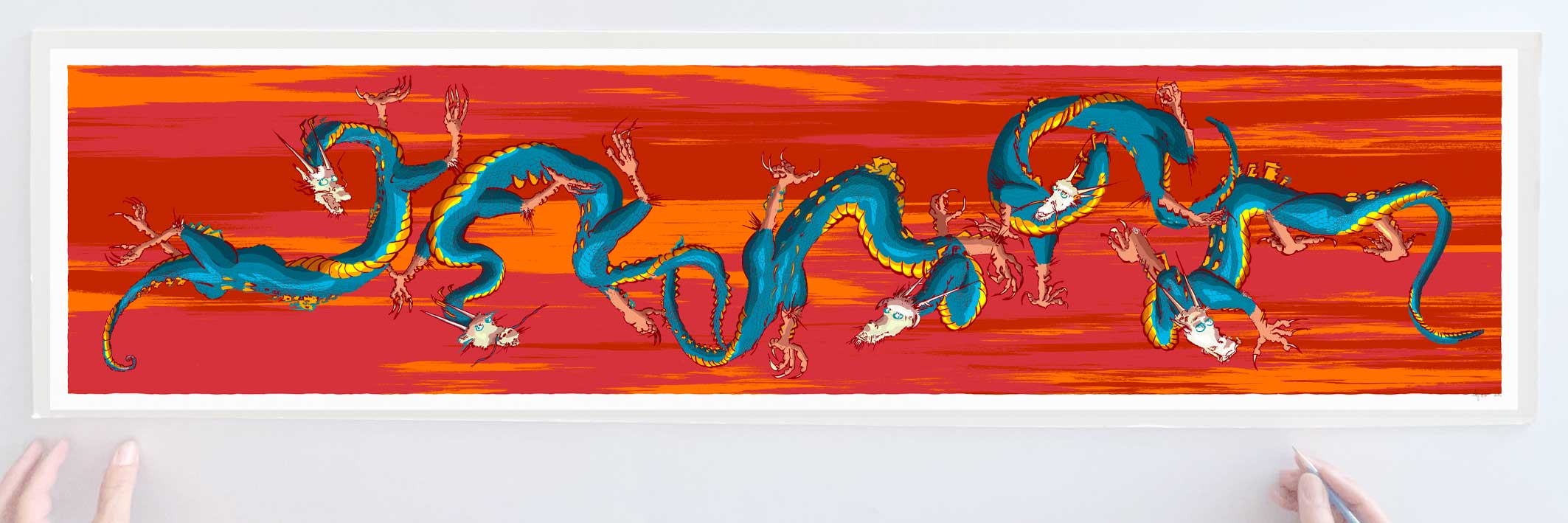 This print shows five dragons I created once I had meticulously studied the dragons that appear on Cheng Rong’s famous scroll ‘Nine Dragons’. This drawing by Cheng Rong is kept at the Museum of Fine Arts in Boston.