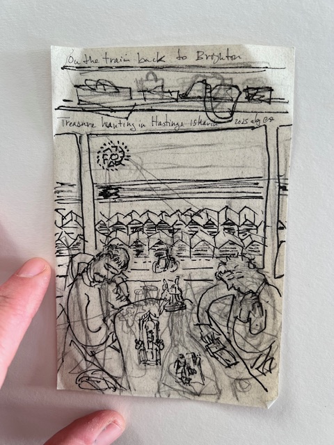 The train line from Brighton to Hastings runs along the South East coast of England. There’s a stretch where the track hugs the sea, passing pebble beaches and rows of beach huts — it’s just lovely. Hastings itself is great for antique hunting — all sorts of things turn up — though somehow I always end up finding a curious little Staffordshire figure.