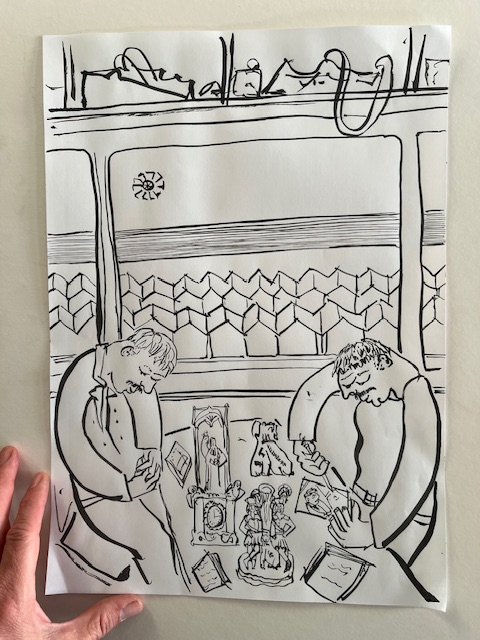 In this print, I’m on the train back with a friend. He’s fallen asleep, as he always does, and I’m, of course, sketching a quick portrait of him snoozing away.