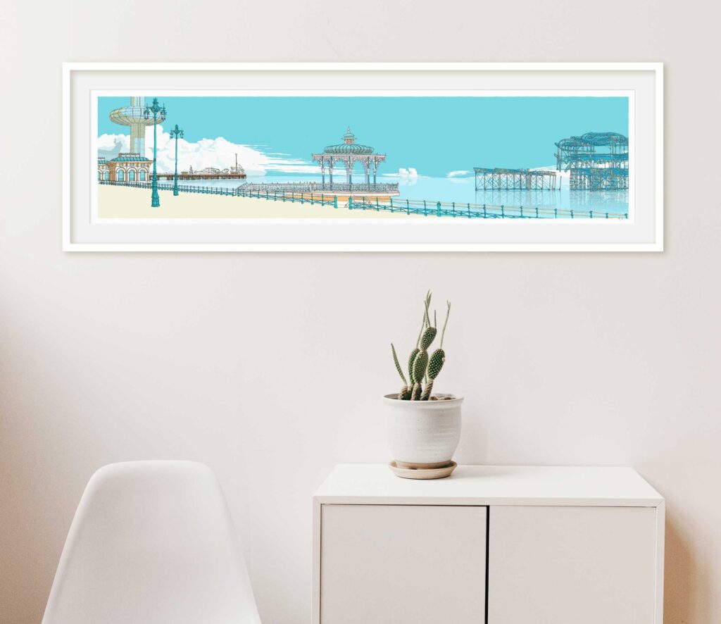 Brighton’s spirit of “Bucket and spade” seaside atmosphere is depicted in this print with the addition of Brighton’s most charismatic landmarks: first on the left corner you can see the British Airways panoramic lift known as the i360 is a 162 m observation tower with commanding views on the English Channel. The tower opened on 4 August 2016. Next to it in the distance you can see the Victorian Brighton Palace Pier. Graham Greene featured this leisure pier in his novel Brighton Rock that somehow still retains the traditional “bucket and spade” seaside atmosphere. The central subject of this print is the famous Brighton Bandstand. Beautiful and unique, The Bandstand, designed by Phillip Lockwood a Brighton Borough Surveyor first opened in 1884 and, the promenade with its distinctive Brighton green painted railing and Chinoiserie style Victorian streetlights.