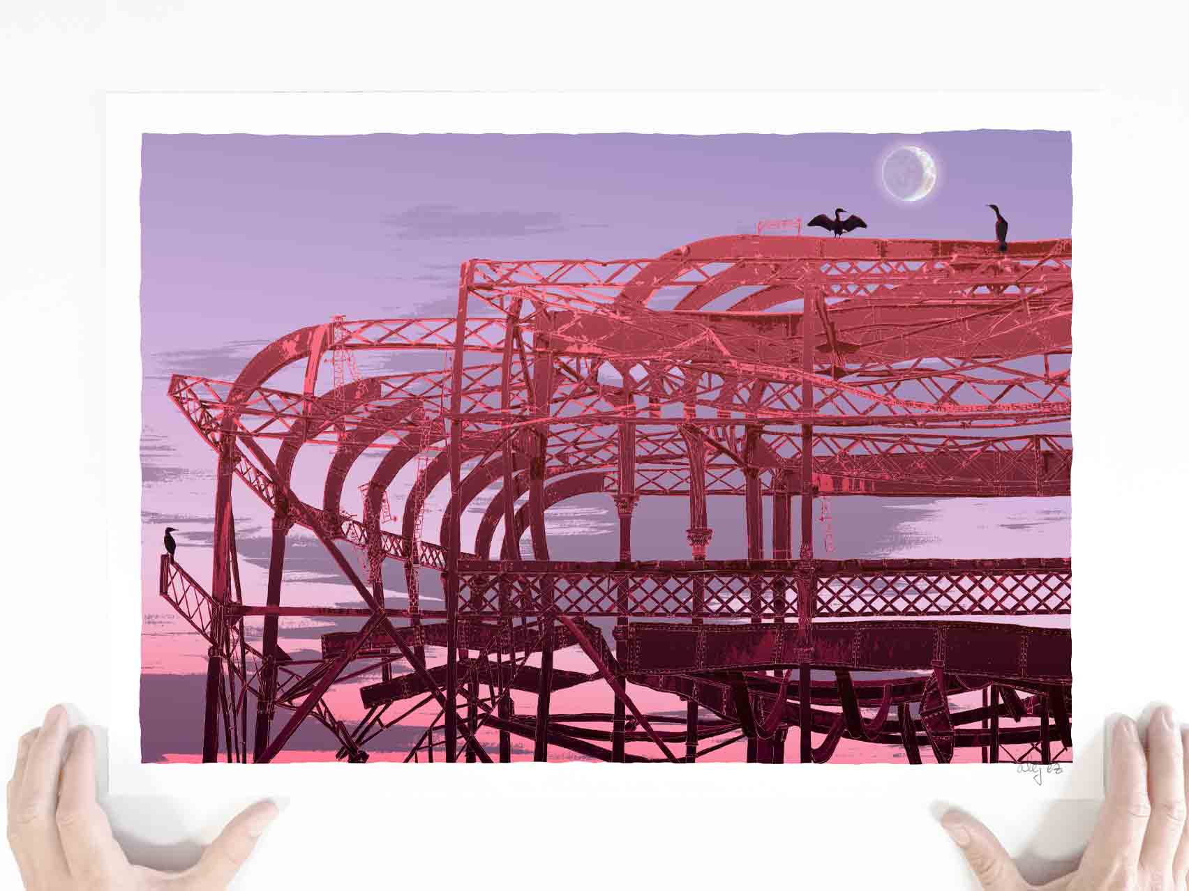 This art print captures a quiet moment at the remains of the West Pier, where cormorants watch a crescent moon hovering above the sea. Their long necks and distinctive profiles are framed by outstretched wings, drying —a natural ritual that keeps their feathers water-resistant for diving.