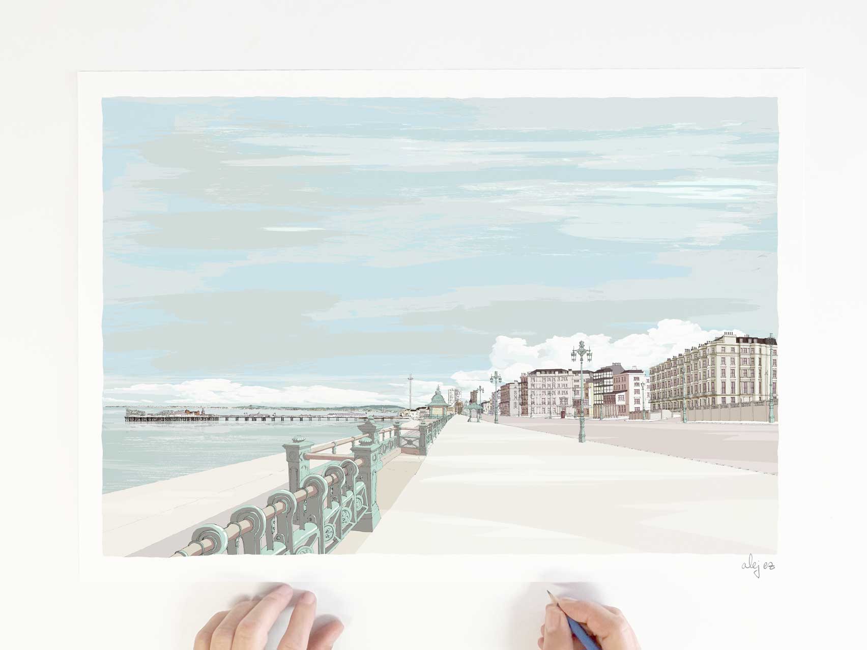 Beach Hut Print. Brighton Seafront by Hove Plinth and Kings House Pebble Beach