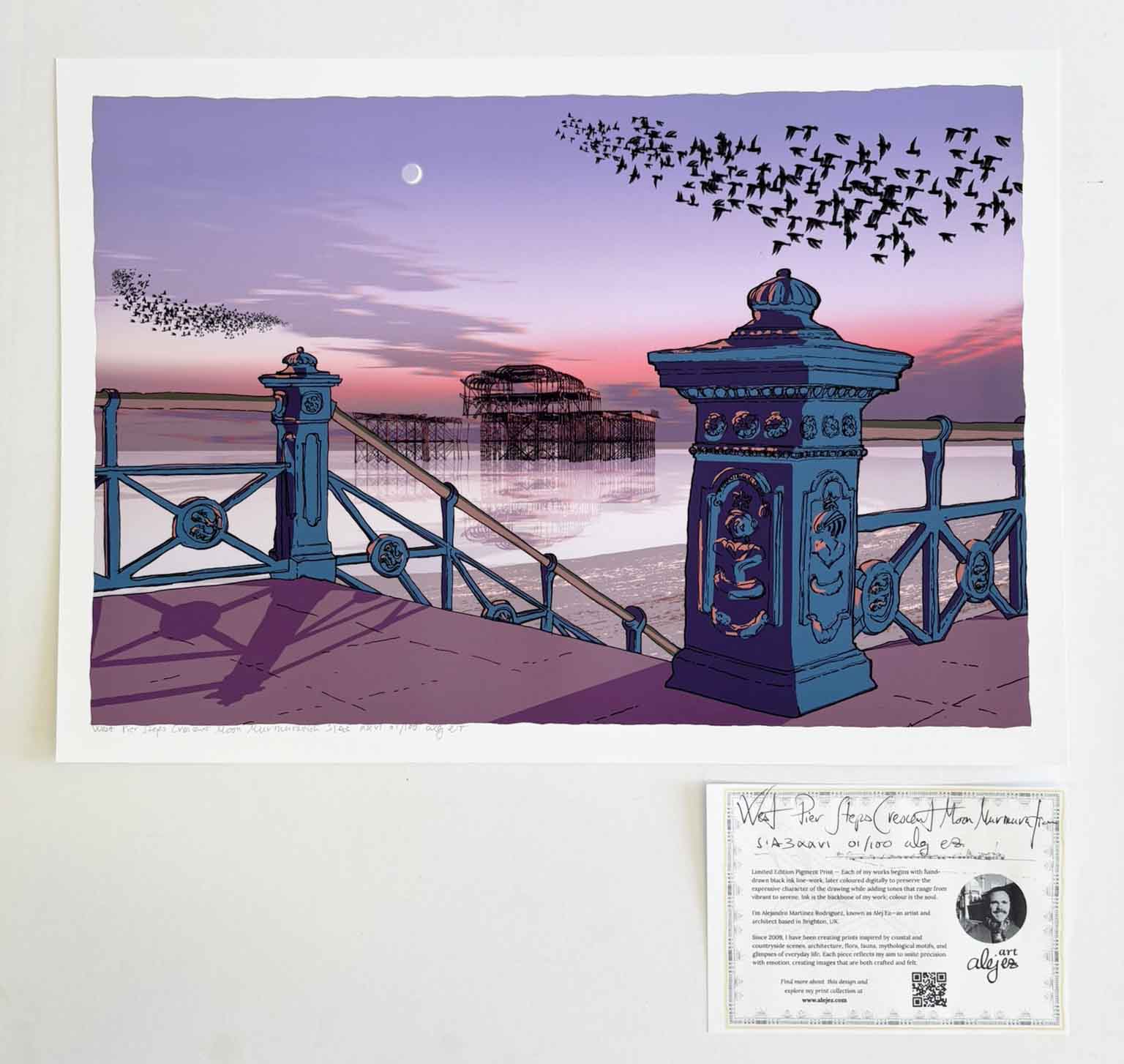 Brighton seafront Victorian railings have beautiful details of mythological dolphins and helmeted heads. At this spot, steps lead to the lower promenade, the beach, and the sea, where the remains of the West Pier stand in the water, surrounded by a murmuration of starlings and a crescent moon in the sky.